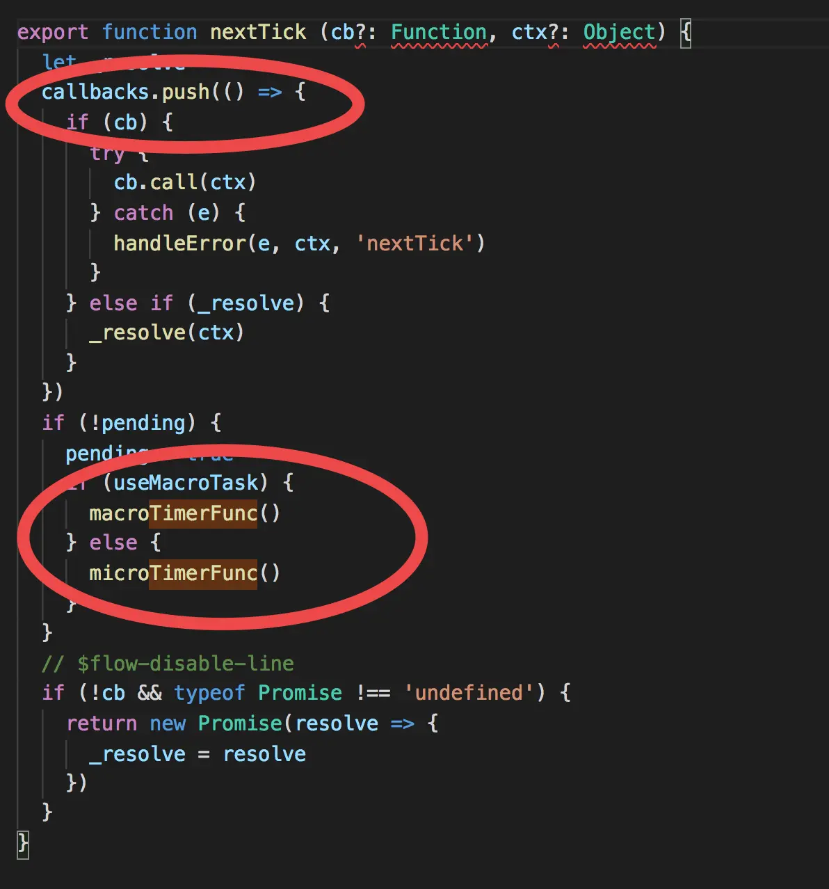 而不管是执行macroTimerFunc或者是microTimerFunc都会在下一个 tick 执行flushCallbacks,flushCallbacks的逻辑非常简单,对callbacks遍历,然后执行相应的回调函数。