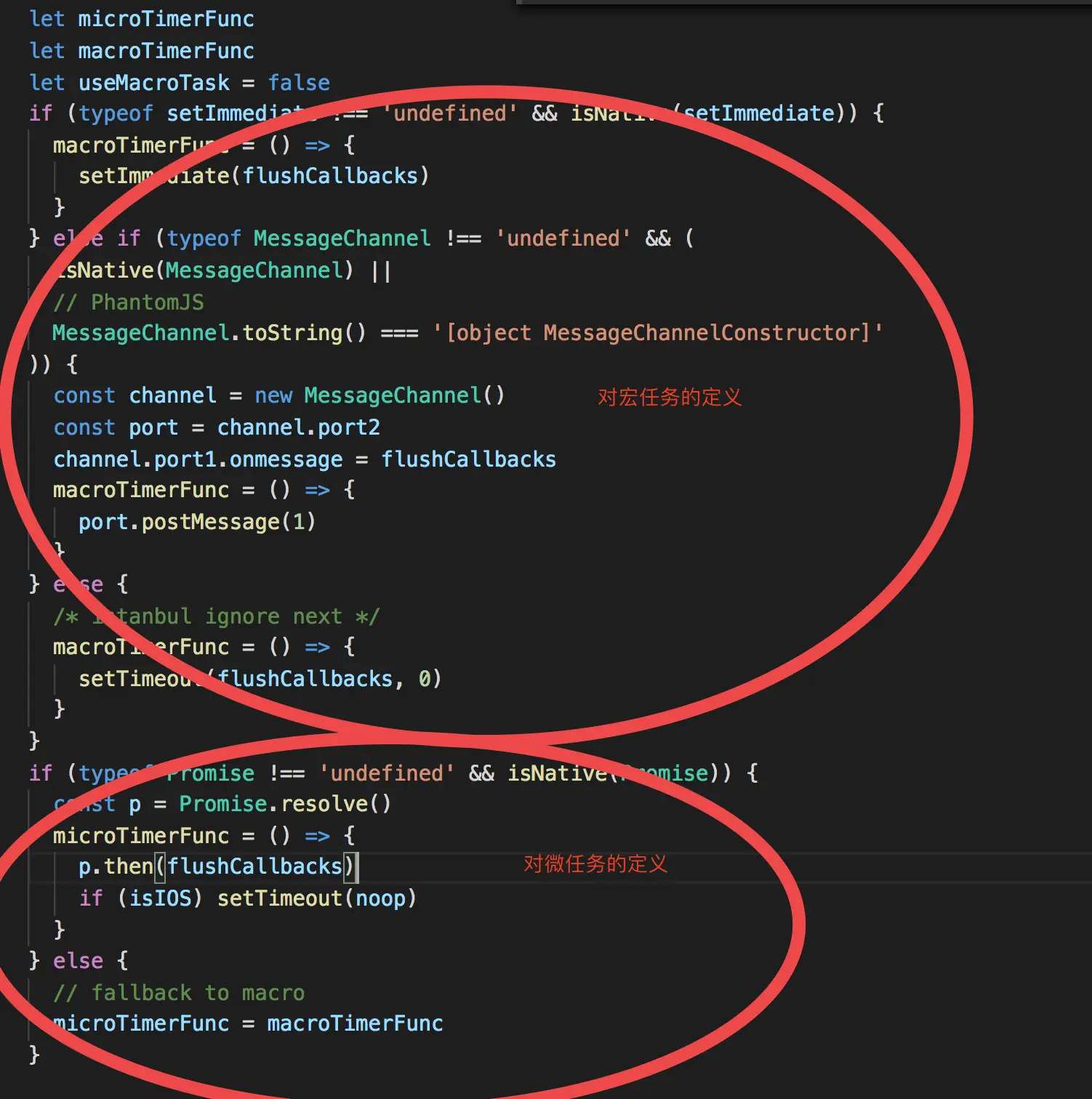 知道了宏任务和微任务的区别,现在让我们正式进入nextTick(flushSchedulerQueue)的分析。这里用到了microTimerFunc和macroTimerFunc2 个变量,它们分别对应的是 microtask的函数和 macrotask的函数。对于macrotask的实现,会先检测是否支持原生setImmediate,因为setImmediate只有高版本的IE 和Edge才支持,如果不支持setImmediate就检测是否支持原生的MessageChannel,如果也不支持的话就会降级为setTimeout;而对于 microtask 的实现,则检测浏览器是否原生支持 Promise,不支持的话直接指向 macrotask 的实现。