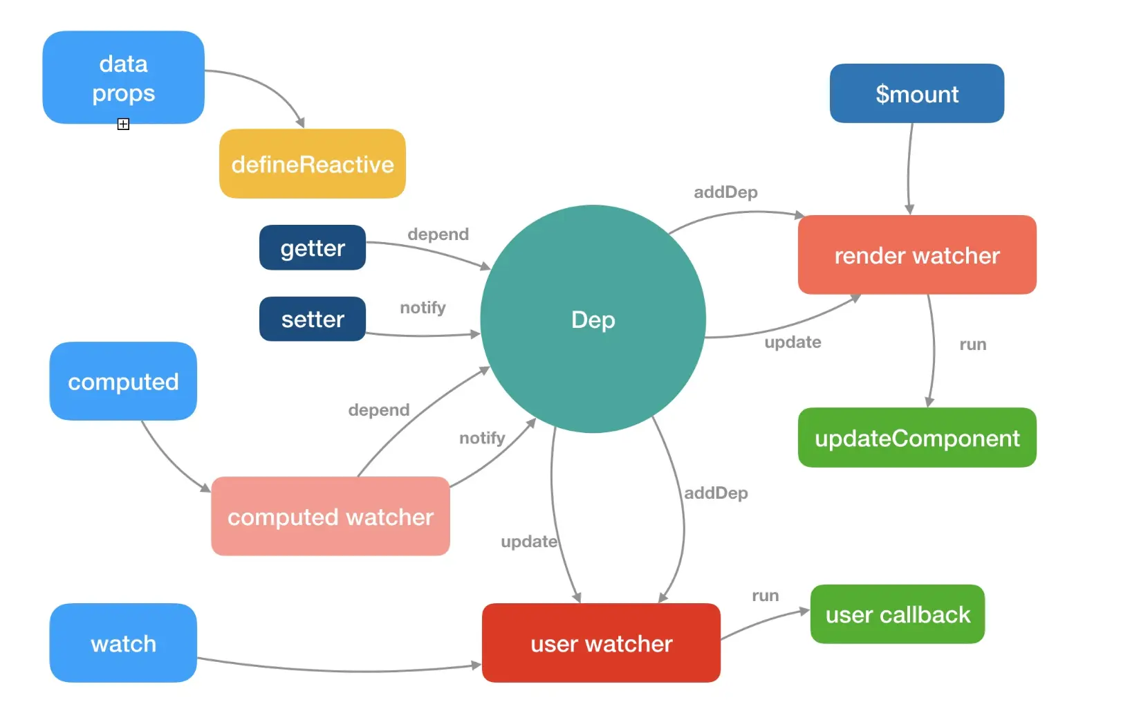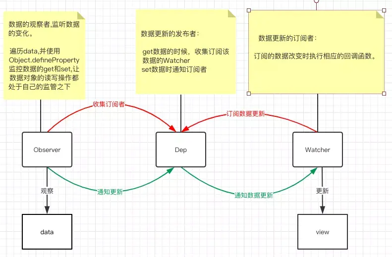 组件中的data的每个属性都有自己的getter、setter方法用于收集依赖和触发依赖。图中红色的箭头表示的是组件渲染过程访问data中数据会触发getter方法,然后通知Dep收集依赖的流程。Dep将订阅数据的Watcher保存下来,便于后面通知更新。图中绿色的箭头表示的是data中的值变化时,会触发setter方法,告诉watcher有依赖发生了变化,