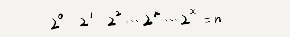 从代码中可以看出,变量 i 的值从 1 开始取,每循环一次就乘以 2。当大于 n 时,循环结束。还记得我们高中学过的等比数列吗?实际上,变量 i 的取值就是一个等比数列。如果我把它一个一个列出来,就应该是这个样子的: