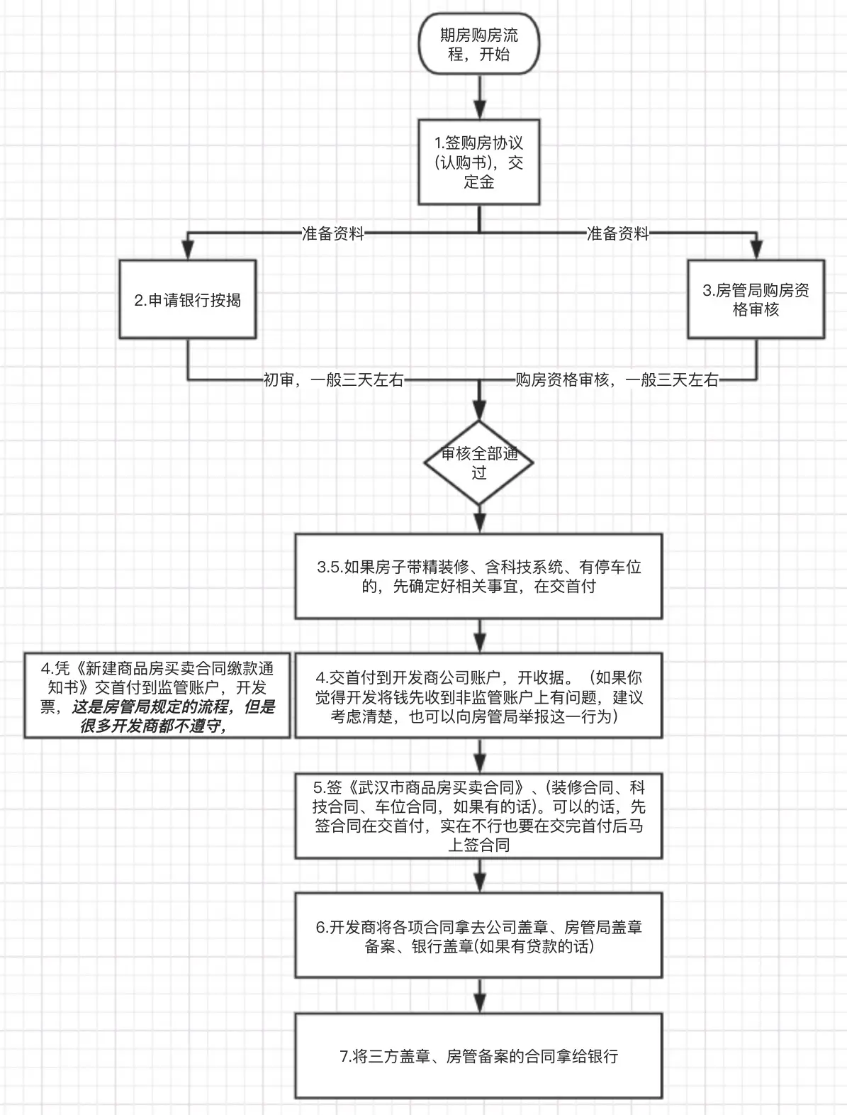 假如你是按照非标准流程走的,强烈建议你跟开发商商量,先签合同在交首付,因为签合同的时候,附加条款里面往往有霸王条款。如果你把首付交了,这个时候就很被动。