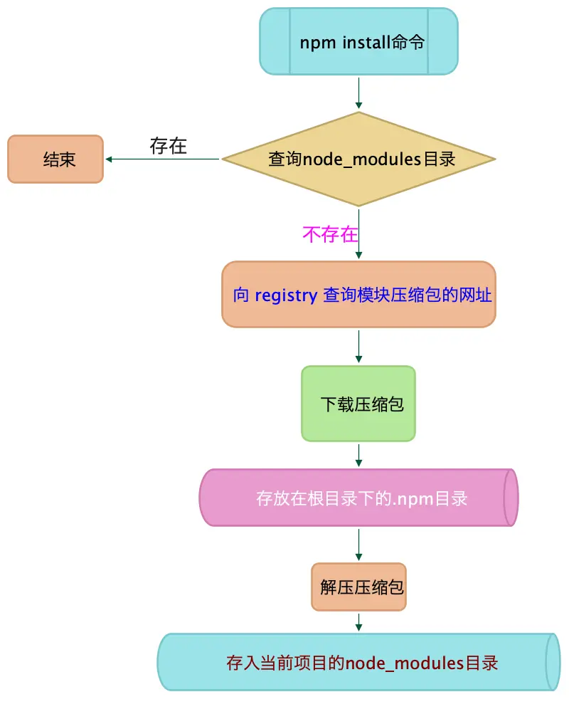 首先,是下载部分,npm install命令之后会先去node_modules目录下寻找是否有相应的模块,如果没有才会根据registry中的压缩包地址去下载。
