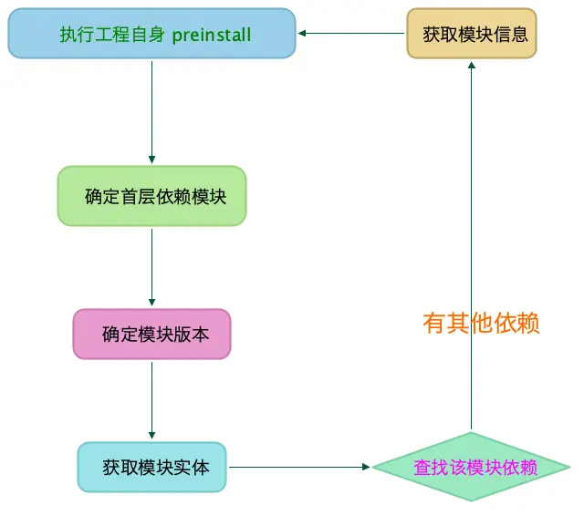首先npm会执行preinstall钩子,如果没定义,则执行空函数后通过。接着,开始安装此模块的首层依赖,这个是通过package.json中dependencies的定义来查找和安装的。工程本身可以看做是整个依赖树的根节点,每个首层依赖树都是这个根节点下面的一颗子树,npm会从首层依赖树的根节点依次寻找更深层次的依赖模块。