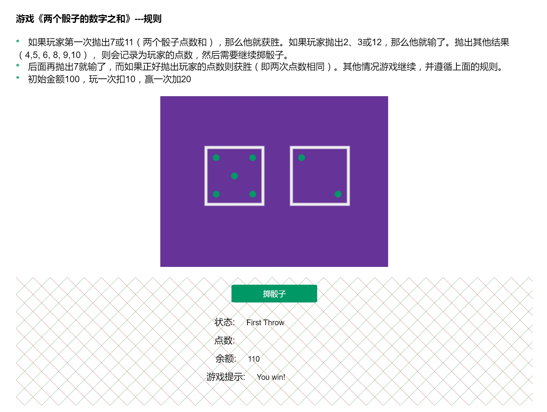 骰子游戏 jiam927 2019-07-27 293 阅读1分钟 在线显示:demo 用到知识要点: canvas绘制图形--矩形和圆形 linear-gradient制作网格背景 根据1-6之间的随机数绘制对应的骰子面。 li::before伪元素设置* width:calc(100vmin - 20px)满足简单的响应式样式 还有一些原生JS的逻辑操作 github源码地址
