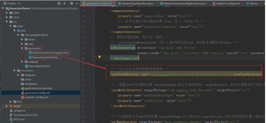 <javaTypeResolver type="com.yangxin.demo.generator.MyJavaTypeResolver"></javaTypeResolver>