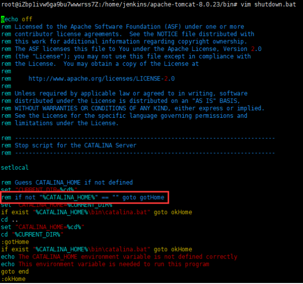 shutdown.bat文件有一句:if not "%CATALINA_HOME%" == "" goto gotHome,执行关闭命令的时候,程序会根据CATALINA_HOME去查找,这句话的意思是如果环境变量配置的这个路径不为空,就执行这个,否则就“set CATALINA_HOME=%CURRENT_DIR%”,也就是将当前的路径赋值给它。