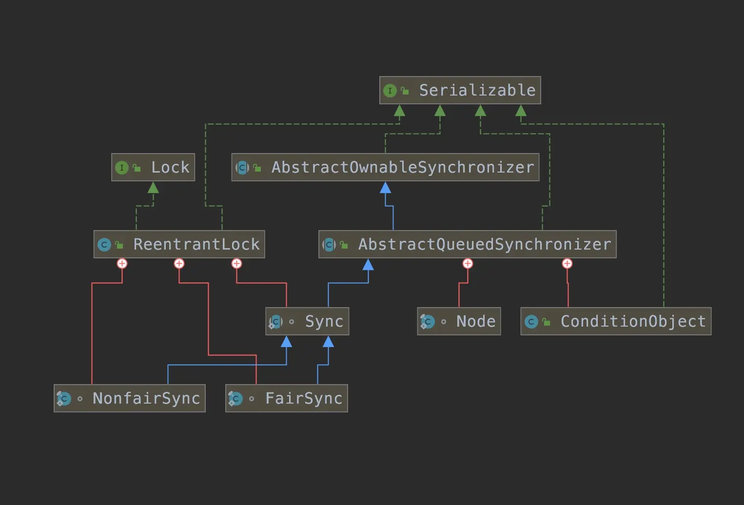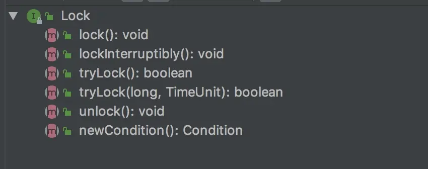 从图中我们可以看到,ReentrantLock实现了两个接口,Lock和Serializable。其中Lock接口里面定义了锁要使用的方法