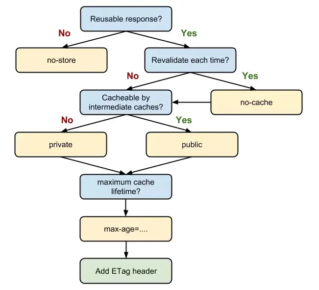 当我们的资源内容不可复用时,直接为 Cache-Control 设置 no-store,拒绝一切形式的缓存;否则考虑是否每次都需要向服务器进行缓存有效确认,如果需要,那么设 Cache-Control 的值为 no-cache;否则考虑该资源是否可以被代理服务器缓存,根据其结果决定是设置为 private 还是 public;然后考虑该资源的过期时间,设置对应的 max-age 和 s-maxage 值;最后,配置协商缓存需要用到的 Etag、Last-Modified 等参数。