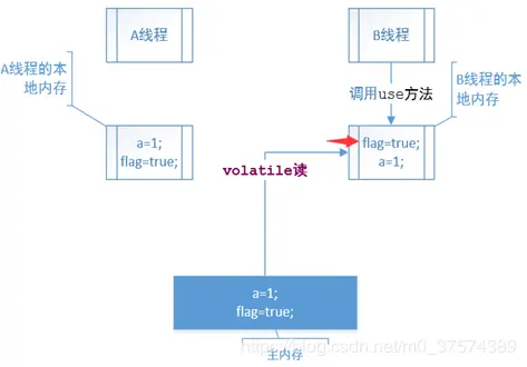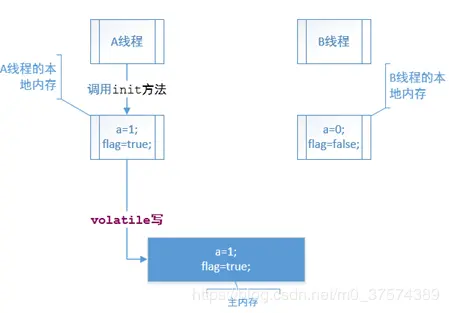 如果我们将flag变量以volatile关键字修饰,那么实际上:线程A在写flag变量后,本地内存A中被线程A更新过的两个共享变量的值都被刷新到主内存中。