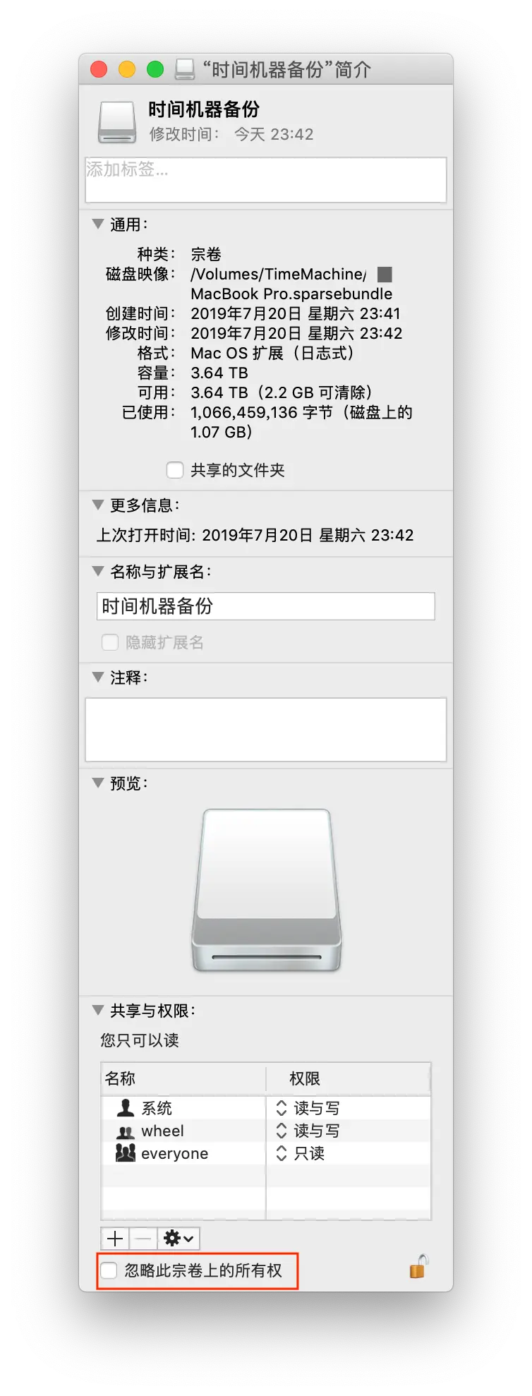 设置权限,取消勾选「忽略此卷宗上的所有权」