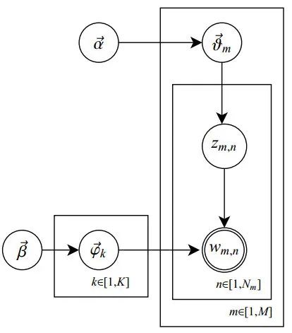 其中,类似Beta分布是二项式分布的共轭先验概率分布,而狄利克雷分布(Dirichlet分布)是多项式分布的共轭先验概率分布。此外,LDA的图模型结构如下图所示(类似贝叶斯网络结构):