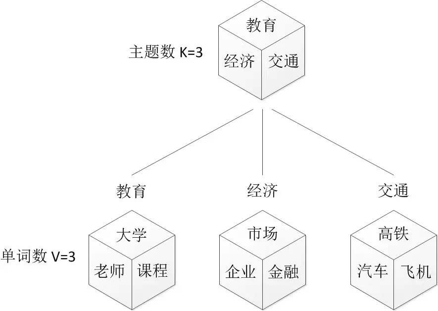比如可令K=3,即制作1个含有3个主题的“文档-主题”骰子,这3个主题可以是:教育、经济、交通。然后令V = 3,制作3个有着3面的“主题-词项”骰子,其中,教育主题骰子的3个面上的词可以是:大学、老师、课程,经济主题骰子的3个面上的词可以是:市场、企业、金融,交通主题骰子的3个面上的词可以是:高铁、汽车、飞机。