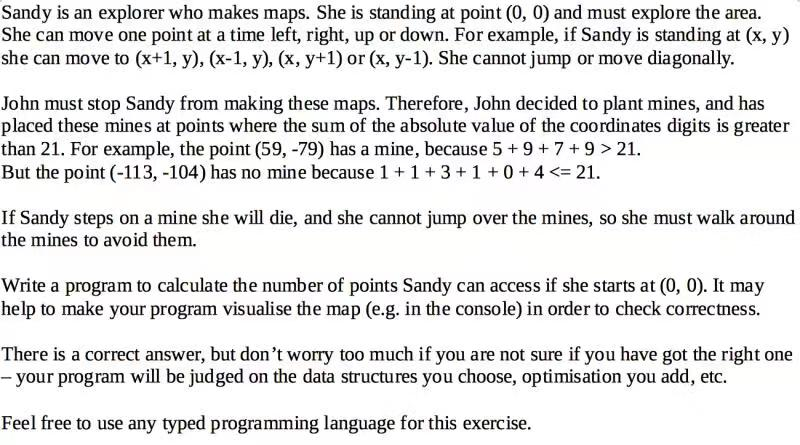 John要阻止Sandy,他会在坐标数字的绝对值之和大于21的地方埋地雷。例如,点(59,-79)有地雷,因为5+7+9+9>21;而点(-113,-104)没有地雷,因为1+1+3+1+0+4<=21。