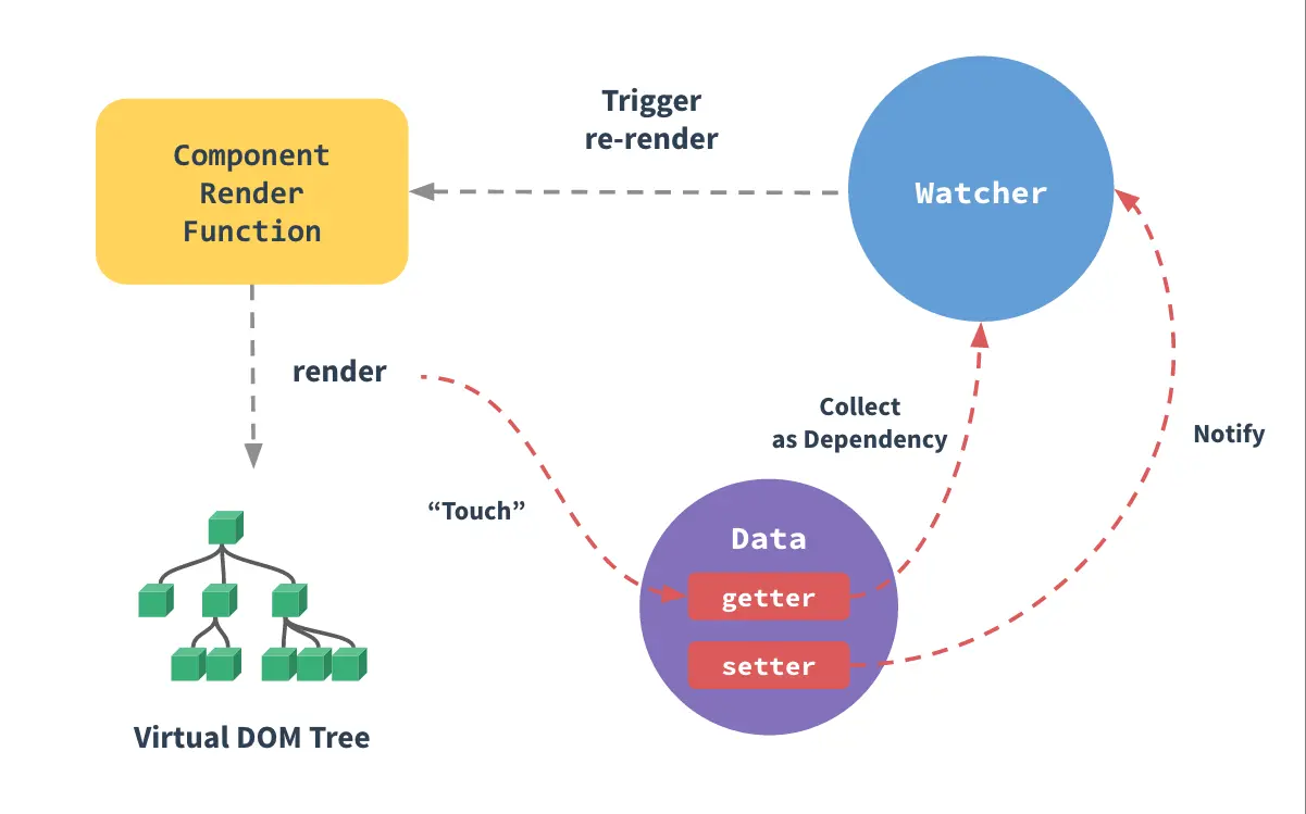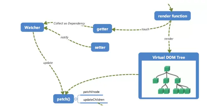在修改对象的值的时候,会触发对应的 setter, setter 通知之前「依赖收集」得到的 Dep 中的每一个 Watcher,告诉它们自己的值改变了,需要重新渲染视图。这时候这些 Watcher 就会开始调用 update 来更新视图,当然这中间还有一个 patch 的过程以及使用队列来异步更新的策略