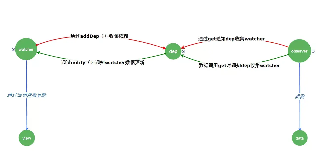 在最后,我们再总结一下这个流程:首先数据从初始化data开始,使用observe监控数据:给每个数据属性添加dep,并且在它的getter过程添加收集依赖操作,在setter过程添加通知更新的操作;在解析指令或者给vue实例设置watch选项或者调用$watch时,生成对应的watcher并收集依赖。之后,如果数据触发更新,会通知watcher,wacther在重新收集依赖之后,触发模板视图更新。这就完成了数据响应式的流程。