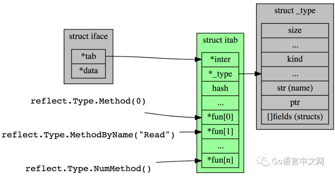 reflect.Type 类型也会允许你访问 itab 部分,来从接口中提取出方法信息。