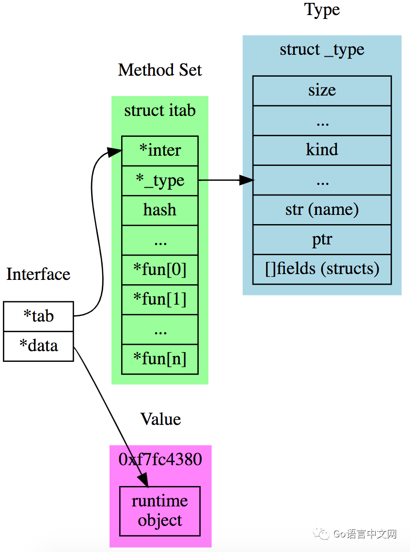 我们可以在该图中很清楚地看到接口内部结构中的三个部分:_type 表示类型信息,*data 是一个指向实际值的指针,itab 则编码了方法集。