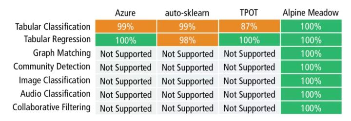 结果是,Alpine Meadow广泛支持各类任务,多才多艺的程度,远远超过其他AutoML系统:
