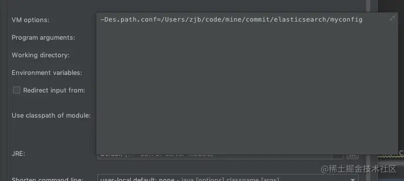 -Des.path.conf=/Users/zjb/code/mine/commit/elasticsearch/myconfig,可以把elasticsearch.yml丢在改文件下,如果没有的话,读取默认配置