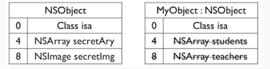 在 Runtime 的现行版本中,最大的特点就是健壮的实例变量。当一个类被编译时,实例变量的布局也就形成了,它表明访问类的实例变量的位置。从对象头部开始,实例变量依次根据自己所占空间而产生位移: