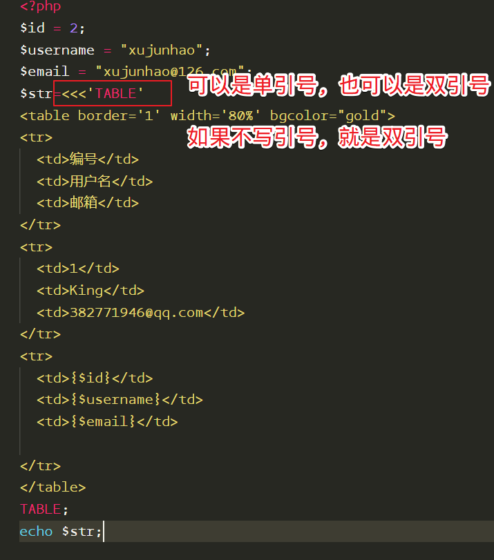$str="<table border='1' width='80%' bgcolor=\"pink\">