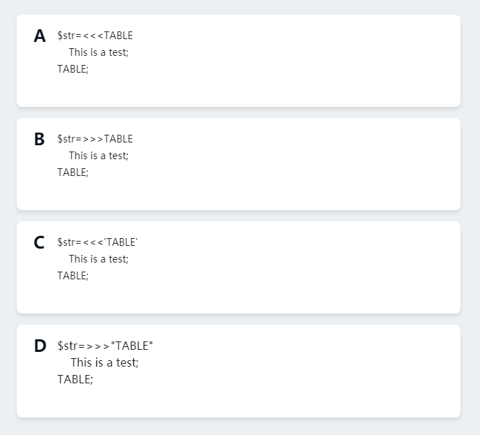 下列变量的声明用到nowdoc定界符的是()(选择一项)
