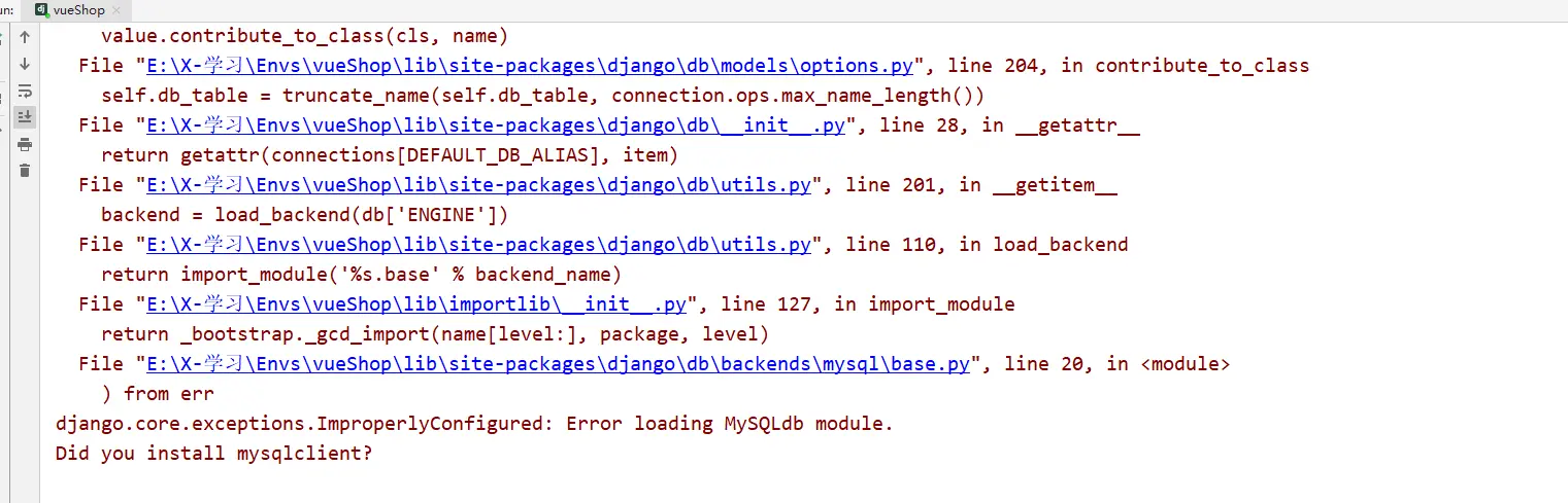 这里提示说,缺少mysql驱动,是否安装 install mysqlclient 安装命令 pip install mysqlclient