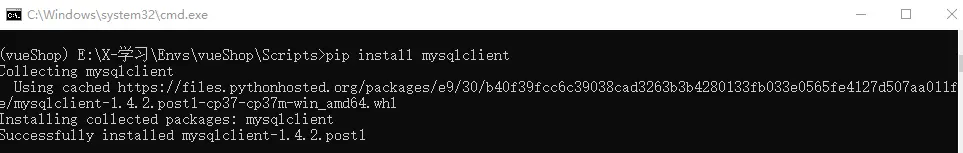 备注:如果在安装mysqlclient的时候,出错了,则需去这个网站https://www.lfd.uci.edu/~gohlke/pythonlibs/,找到对应的mysqlclient包,下载,在安装一下这个包,安装成功了,就没有问题,这我就不再演示,我已经在全局安装过这个包了