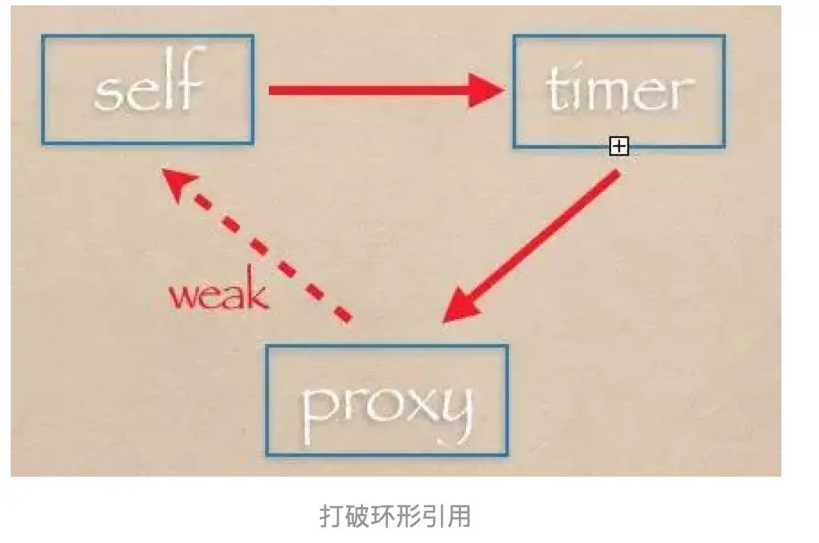 引入一个对象proxy,proxy弱引用 self,然后 proxy 传入NSTimer。即self 强引用NSTimer,NSTimer强引用 proxy,proxy 弱引用 self,这样通过弱引用来解决了相互引用,此时不会形成环