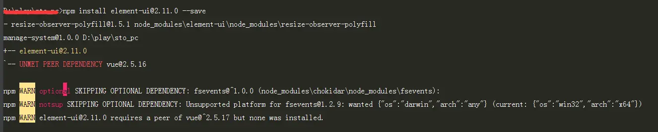 从图中看到 element-ui@2.11.0 安装成功,但是vue@2.5.16的版本不满足对等依赖,需要 vue@2.5.17版本。