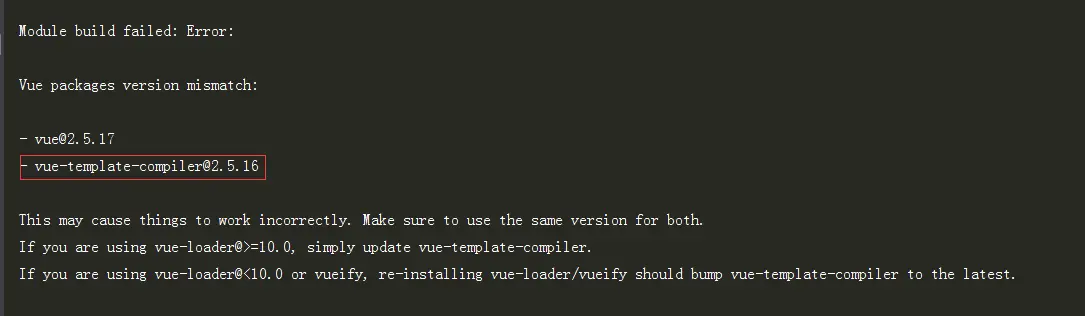 提示运行失败,我来看下原因:模块生成失败, vue-template-compiler@2.5.16版本 不一致,同样我们需要更新vue-template-compiler@2.5.17