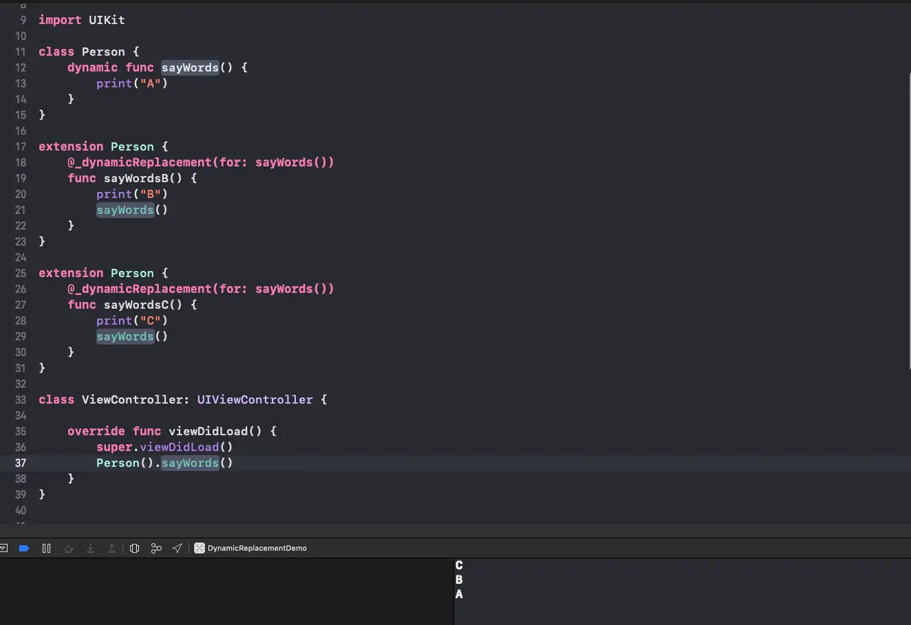当然我们今天要说的不是 ObjC,因为 ObjC 在 Runtime 机制上都是可以预期的。如果我们使用 Swift 5.0 中 Dynamic Method Replacement 方案在 Swift 工程中实现这种场景。