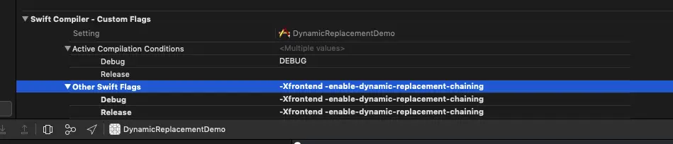 在命令参数中增加了 -Xfrontend -enable-dynamic-replacement-chaining ,第一反应:这个东西像 Build Settings 中的 Flags。翻看了 Build Settings 中所有的 Compile Flags,将其尝试写入 Other Swift Flags 中: