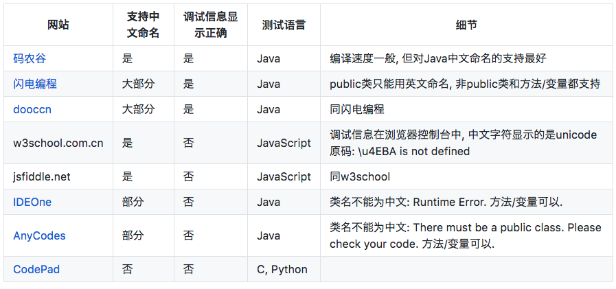参考哪些比较好的在线编程网站?, 测试各个网站对中文命名的代码的支持, 包括调试信息等(见向LeetCode报告编译信息中Unicode显示问题).