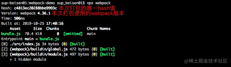 webapck index.js会去全局寻找webpack,如果想要使用项目中的webpack进行打包就需要执行命令npx webpack -