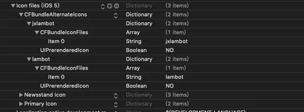 - 我们需要加入我们需要的键——CFBundleAlternateIcons,类型为 Dictionary。