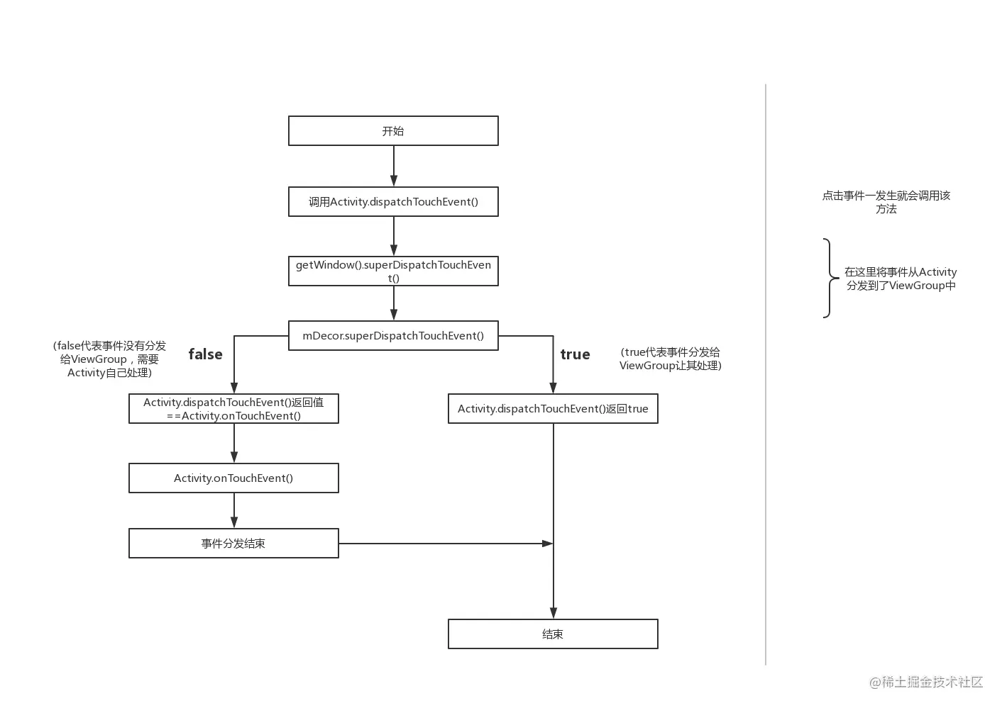仔细观察可以看到,当MyViewGroup的dispatchTouchEvent返回false时,Activity的onTouchEvent会被调用,返回true时,不会被调用,这是什么原因呢?