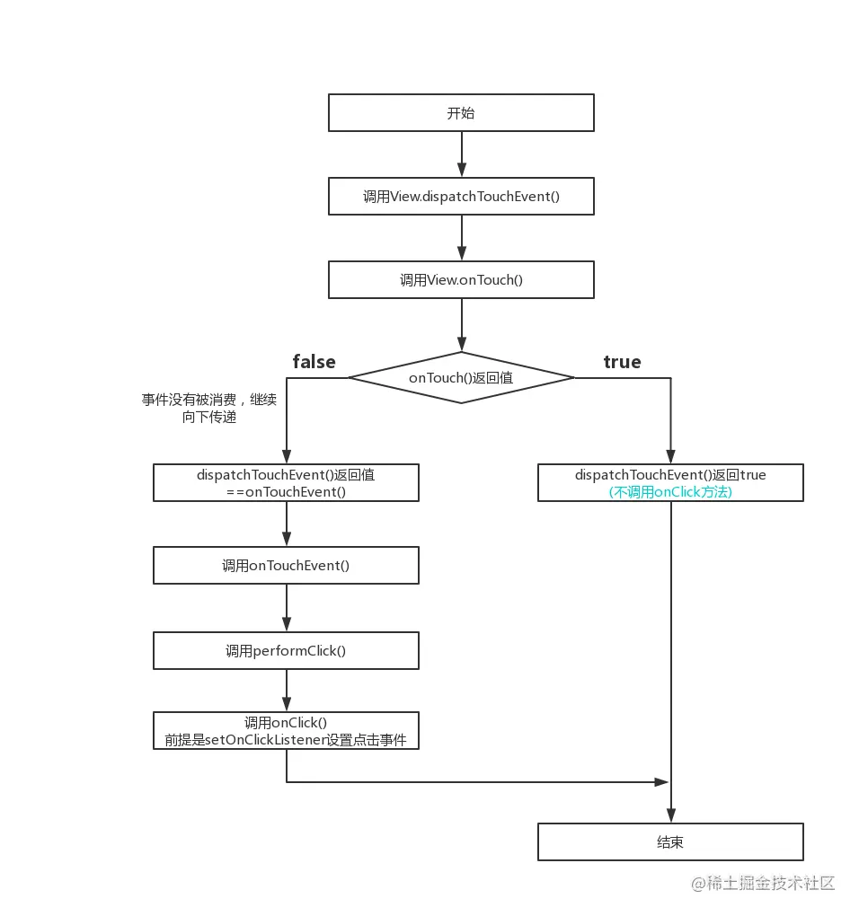 可以看到当View的onTouch()方法返回false时,View的onTouchEvent()方法和onClick()方法会被调用,当返回true时,这两个方法都不会被调用。这是什么原因呢?