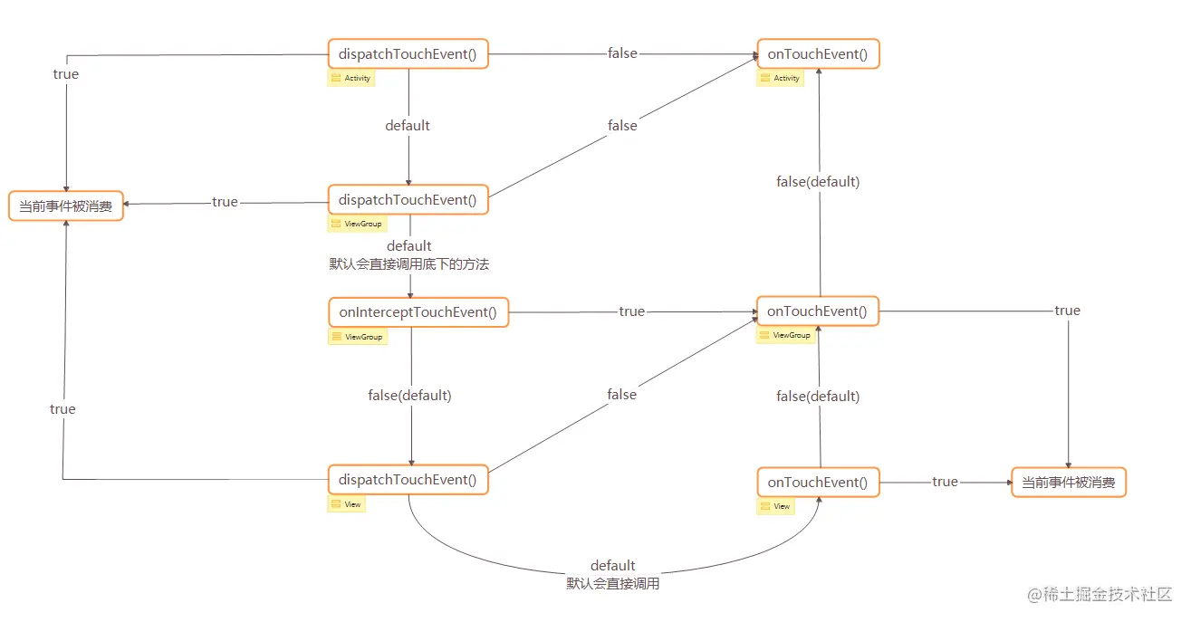 默认状态下事件是按照从Activity到ViewGroup再到View的顺序进行分发的,分发下去处不处理是另一回事,分发完成后,不处理则向上一层回调,调用上一层的onTouchEvent进行处理事件,若onTouchEvent返回true,则表示在该层消耗了事件,若返回false,表示事件还没被处理,需要再向上回调一层,调用上一层的onTouchEvent方法。