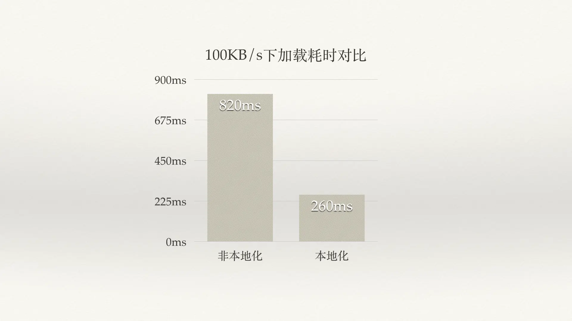 从上面两个优化点我们可以看到所有的优化还是网络的优化,主要还是在移动端网络对性能的影响是远远大于其他方面的。那么是否有什么方案能够让我们免去这些网络请求呢,最终我们给的答案就是详情页本地化。通过本地化方案,我们将平均 820ms 的首屏渲染时间优化到了 260ms,整整提高了三倍多!