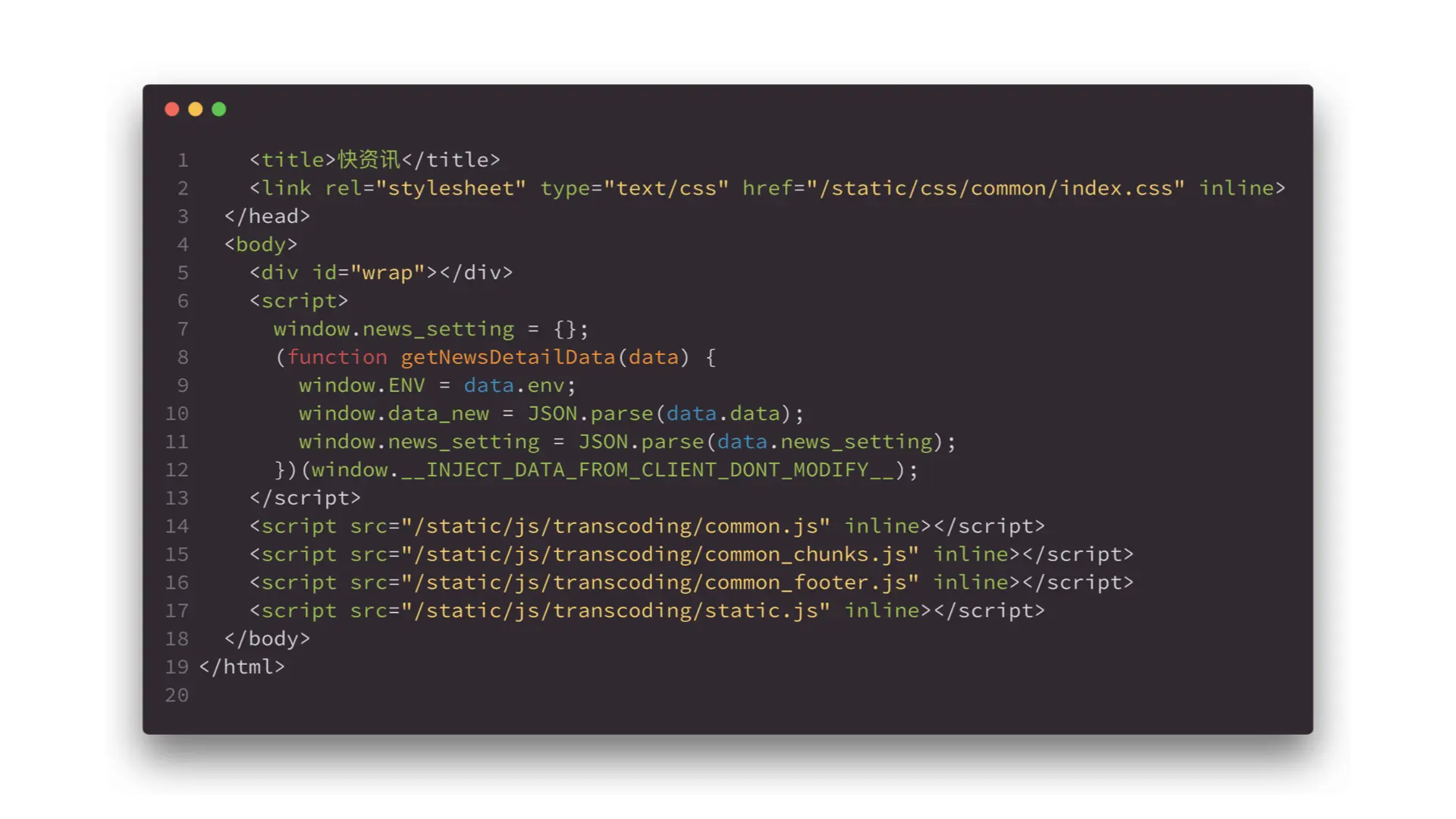 如图所示所有静态资源都被标记了 inline 属性,我们的编译工具在读取到这个属性后会将当前资源给内联到 HTML 中。同时大家注意到该模板不是以 <html> 开头的,而是有一些截断。这是为了给客户端提供注入数据空间,客户端通过模板字符串拼接的形式将新闻数据注入到全局变量中最终完成整个新闻页面的获取。前端代码中则直接使用 __INJECT_DATA_FROM_CLIENT_DONT_MODIFY__ 全局变量获取注入的数据。