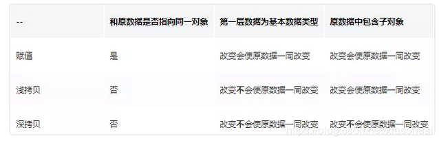 上面例子中,obj1是原始数据,obj2是赋值操作得到,而obj3浅拷贝得到。我们可以很清晰看到对原始数据的影响,具体请看下表: