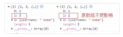 对于字符串、数字及布尔值来说(不是 String、Number 或者 Boolean 对象),slice 会拷贝这些值到新的数组里。在别的数组里修改这些字符串或数字或是布尔值,将不会影响另一个数组。