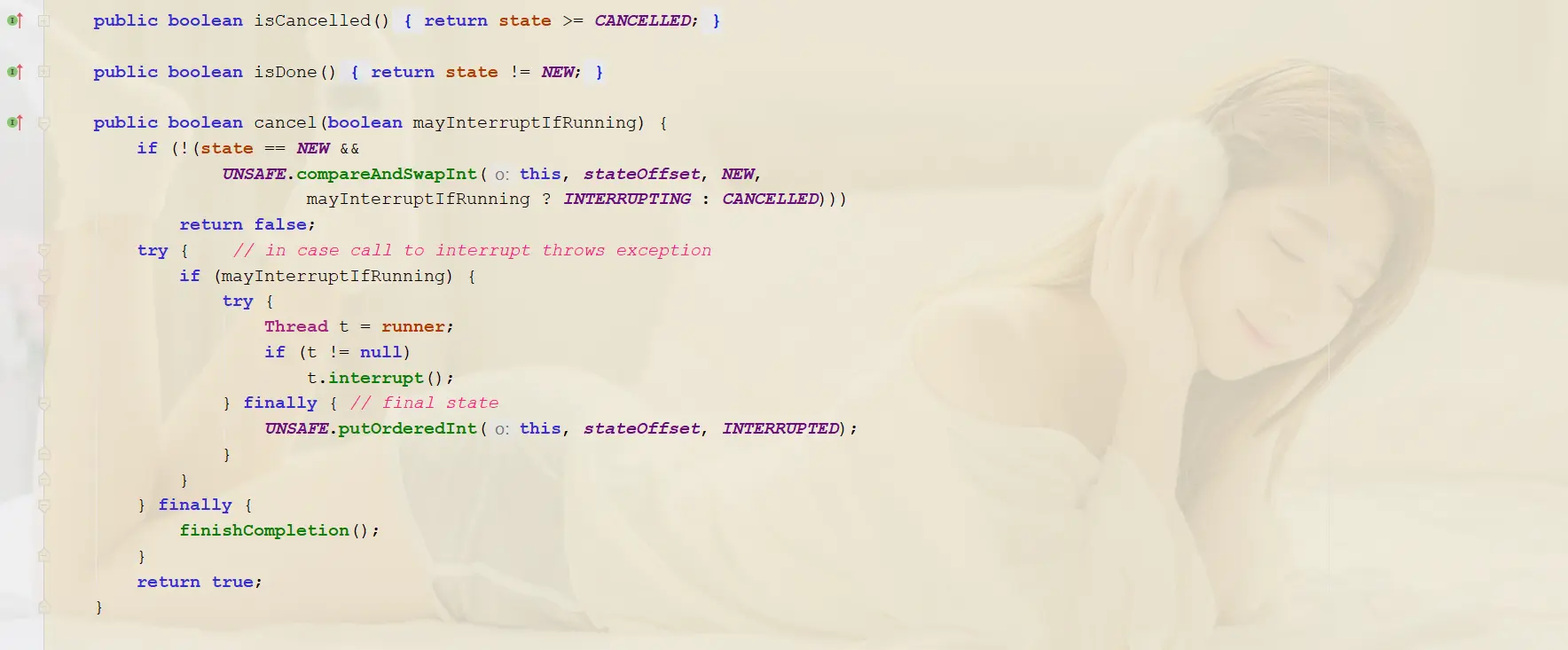 - 如果state为INTERRUPTING, 则主动让出CPU,自旋等待别的线程执行完中断流程。见handlePossibleCancellationInterrupt(int s) 方法。