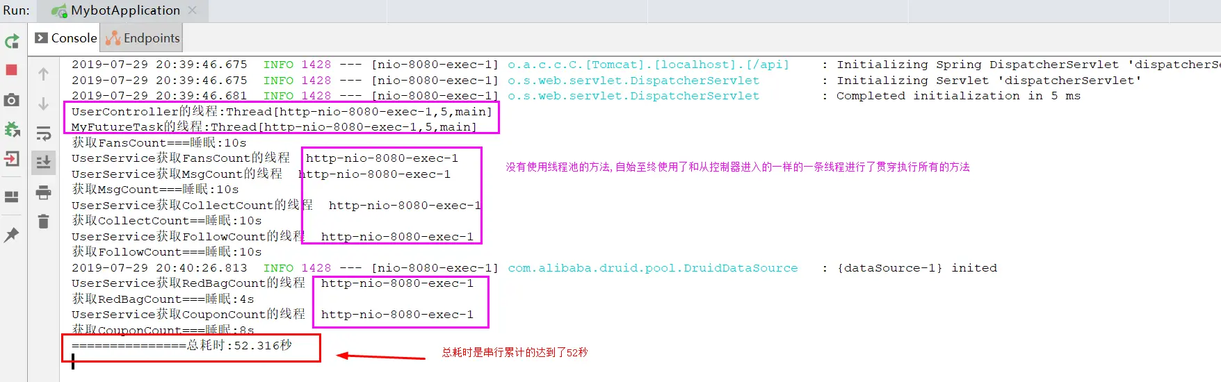 User_Async_FutureTask-%d, 总耗时从累计的52秒缩短到10秒,即取决于最耗时的方法查询时间.