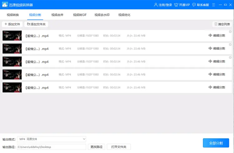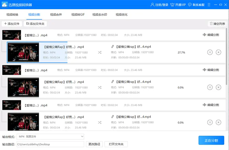 5、最后全部分割完成之后点击全部分割按钮,等待软件分割到100%,那么,所有的视频文件就分割完成了。