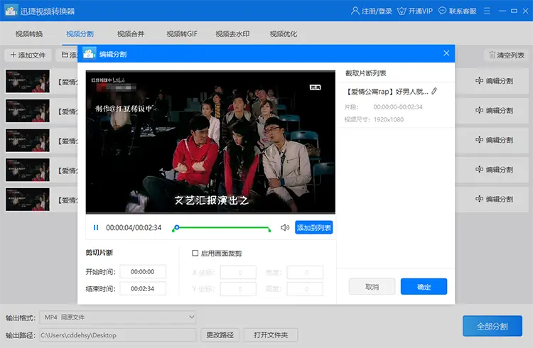 4、点击编辑分割按钮然后在框框中选择视频片段的开始时间和结束时间,然后点击添加到列表即可,也可以裁剪画面,