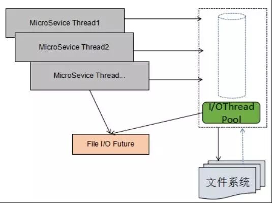将文件 I/O 操作封装成一个 Task 或者 Event,投递到文件 I/O 线程池的消息队列中,根据投递结果,构造 I/O 操作相关联的 Future 对象给微服务调用线程。通过向 Future 对象注册 Listener 并实现 callback 接口,可以实现异步回调通知,这样微服务和文件 I/O 操作就实现了线程隔离。 文件 I/O 操作耗时,并不会阻塞微服务调度线程。