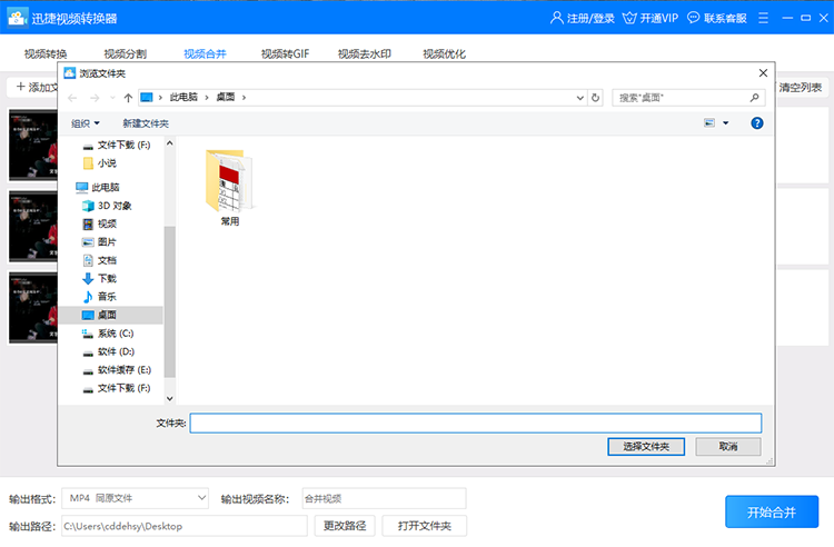 3、然后点击软件下方的更改路径并在选择保存位置的对话框中选择输出视频的保存地址在桌面上,然后点击打开文件夹进行确认,