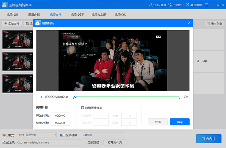 4、点击编辑按钮然后在框框中选择视频片段的开始时间和结束时间,然后点击添加到列表即可,也可以裁剪画面,